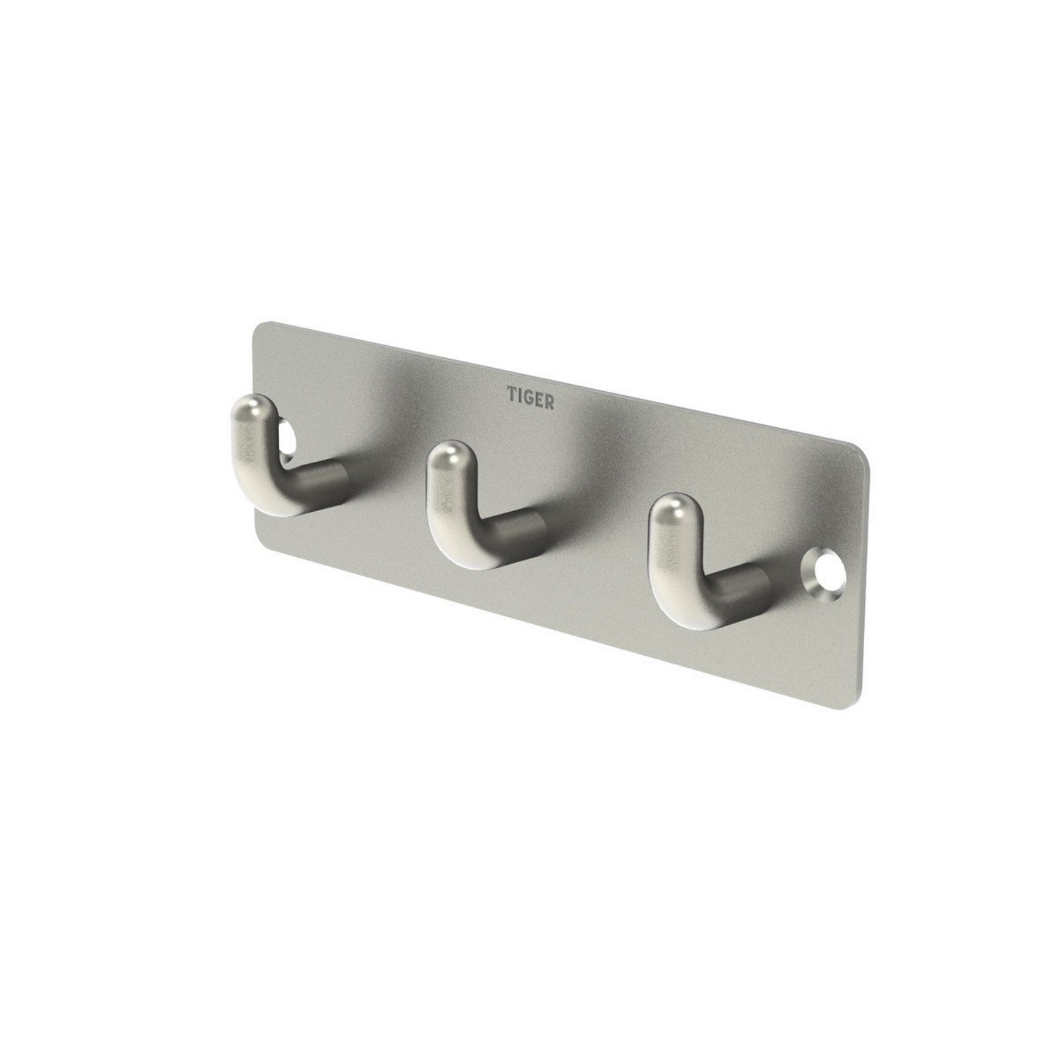 Hakenrek Tiger Pinky Metaal RVS Deze stijlvolle haak van het merk Tiger is gemaakt van geborsteld roestvrij staal, het materiaal is licht mat zilver van kleur. De 3-delige haak is eenvoudig te bevestigen met de bijgeleverde schroeven. De haak kan worden gebruikt voor het ophangen van bijvoorbeeld uw handdoek en/of badjas en heeft een moderne uitstraling. De producten van het merk Tiger zijn allen voorzien van 5 jaar fabrieksgarantie. Specificaties Hakenrek Tiger Pinky: – Hakenrek – Tiger Pinky – RVS – Hoogte 4 cm – Breedte 13 cm – Diepte 2.3 cm – Garantie: 10 jaar
