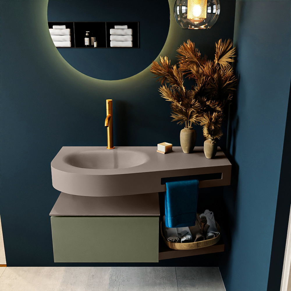 MONDIAZ RIVA 100cm badmeubel onderkast / planchet kleur Army met 1 lade. Wastafel DULCET links 1 kraangat kleur Smoke.